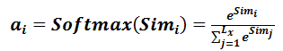 第一阶段产生的分值根据具体产生的方法不同其数值取值范围也不一样,第二阶段引入类似SoftMax的计算方式对第一阶段的得分进行数值转换,一方面可以进行归一化,将原始计算分值整理成所有元素权重之和为1的概率分布;另一方面也可以通过SoftMax的内在机制更加突出重要元素的权重。即一般采用如下公式计算: