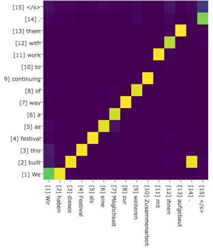 目标句子生成的每个单词对应输入句子单词的概率分布可以理解为输入句子单词和这个目标生成单词的对齐概率,这在机器翻译语境下是非常直观的:传统的统计机器翻译一般在做的过程中会专门有一个短语对齐的步骤,而注意力模型其实起的是相同的作用。