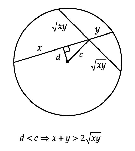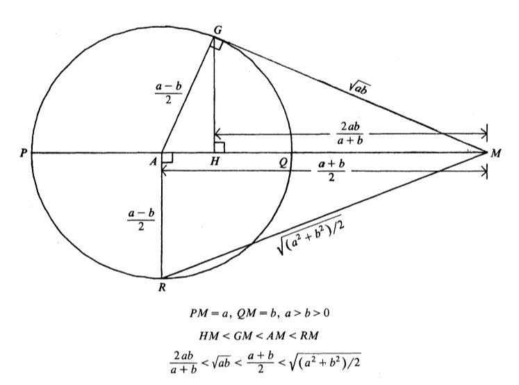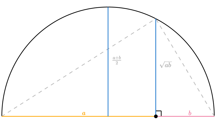 上图中的半圆直径长度为 a+b,所以半径的长度为 (a+b)/2,也就是 a 和 b 这两个数的算术平均值。利用射影定理,只要沿着 a 线段与 b 线段的交点做一条垂线,我们就能得到几何平均。