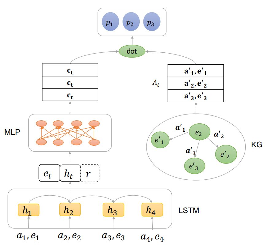 为了处理多跳连接推测的问题,人们提出过各种各样的方法。一些诸如 PRA(Path Ranking Algorithm,路径排序算法)(Lao et al., 2011; Gardner et al., 2014, 2013) 的早期研究使用可重复启动的有界深度(bounded-depth)随机游走来获取路径。最近 DeepPath (Xiong et al., 2017) 和 MINERVA (Das et al., 2017) 将路径搜索问题设置为一个马尔可夫决策过程(MDP)并利用强化学习(RL)将预期的返回值最大化。与我们的工作同时进行的另一项工作是「推理链」(Chain-of-Reasoning,Das et al., 2016) 和复合推理 (Compositional Reasoning,Neelakantan et al., 2015) 的研究,即以 PRA 学习到的多跳链为输入来推断其关系。