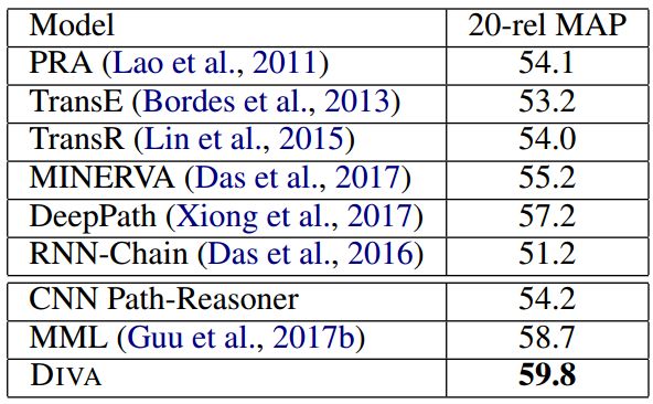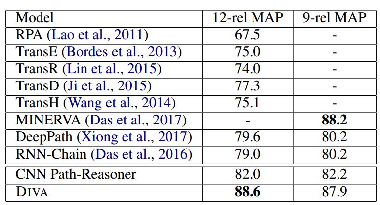 表 2:基于 NELL 数据集的 MAP 结果。鉴于 MINERVA (Das et al., 2017) 只取用了 12 个初始关系中的 9 个,我们在此展示了 NELL-995 数据集两个版本的结果。
