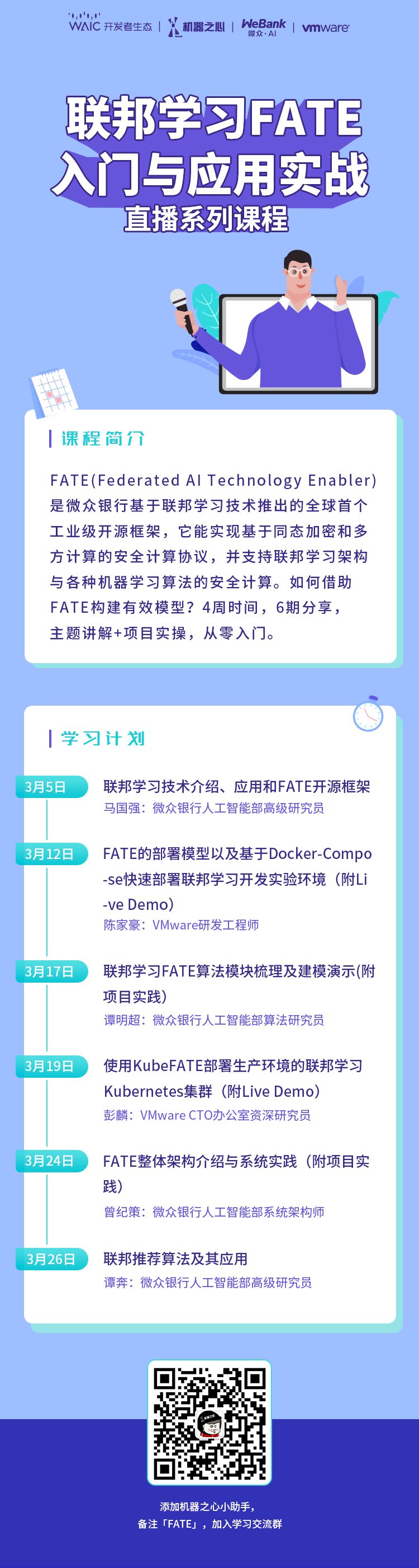 机器之心与微众银行联合开设《联邦学习 FATE 入门与应用实战》线上公开课,4 周时间,6 期课程,主题演讲+项目实践+在线答疑,从零入门联邦学习。系列第一课将于 3 月 5 日开始。添加机器之心小助手,免费加入学习计划。
