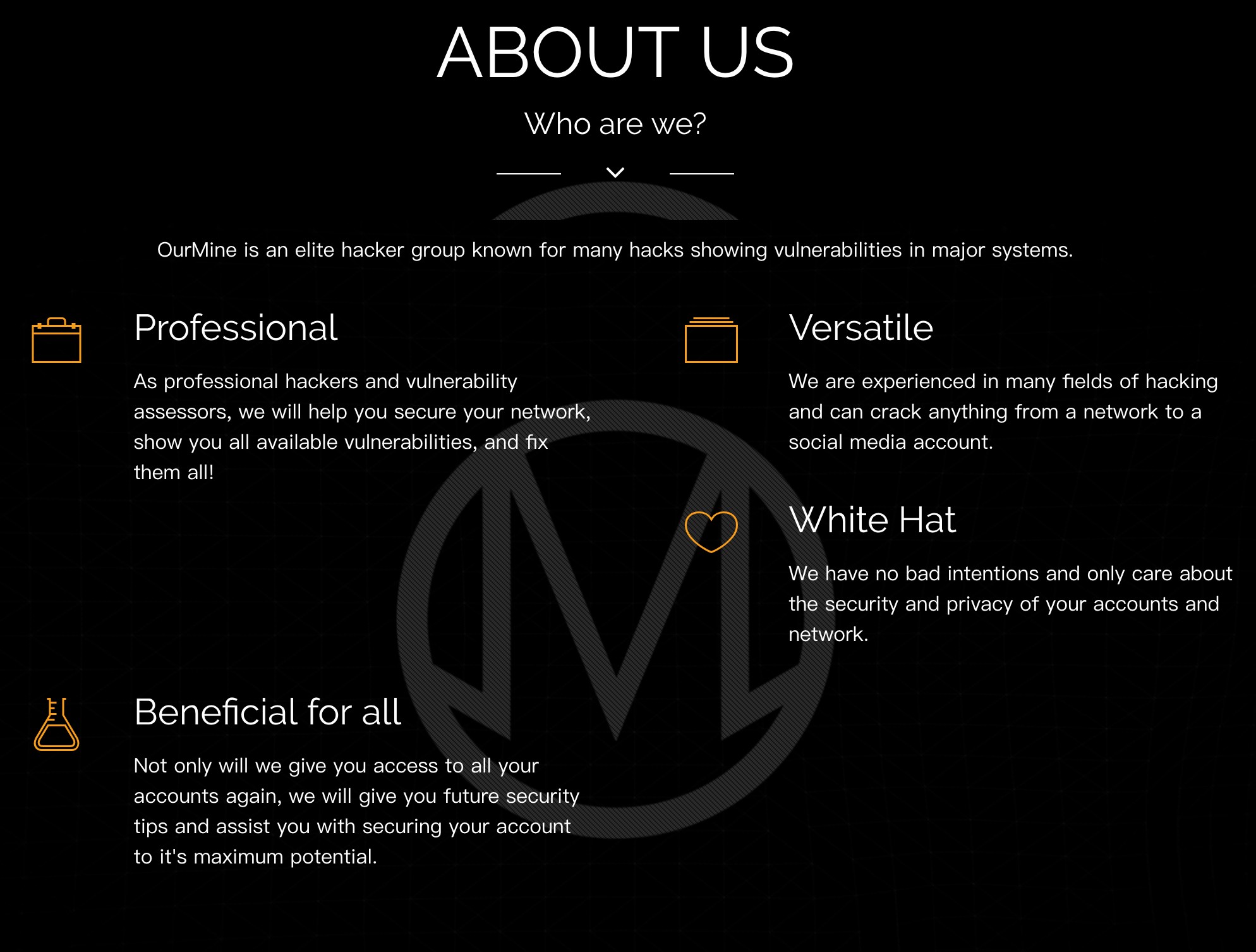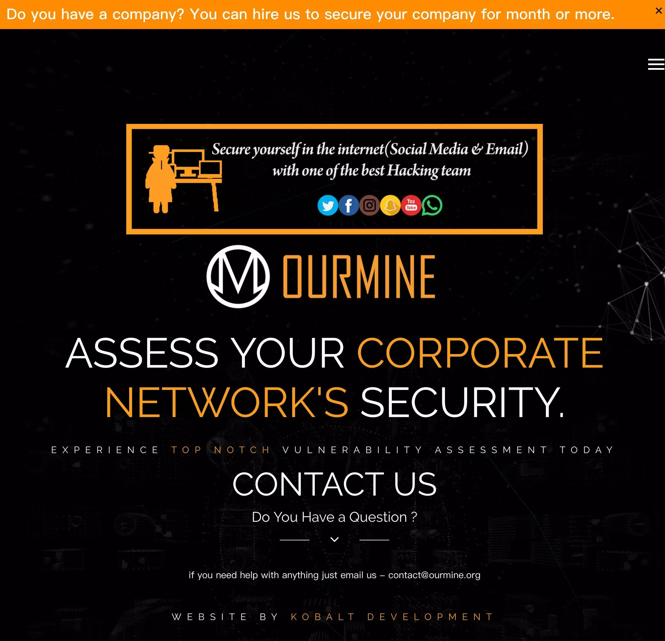 OurMine首页整体色调为橙色和黑色和白色,首页的最上方有一个醒目的橙色横幅,意为:你管理着一家公司吗?雇我们负责贵公司的安全防护吧,一个月起步。点击横幅后会跳转至“联系我们”页面,留有一个OurMine的电子邮箱。