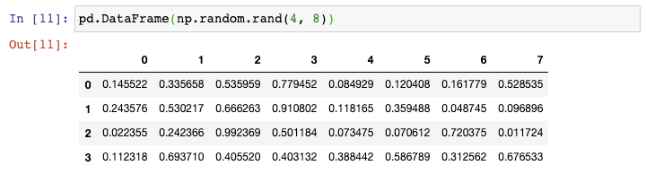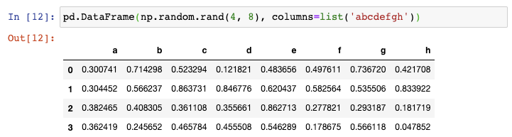 现在如果你需要创建一个更大的DataFrame,上述方法则需要太多的输入。在这种情况下,你可以使用Numpy的random.rand()函数,告诉它行数和列数,将它传递给DataFrame constructor: