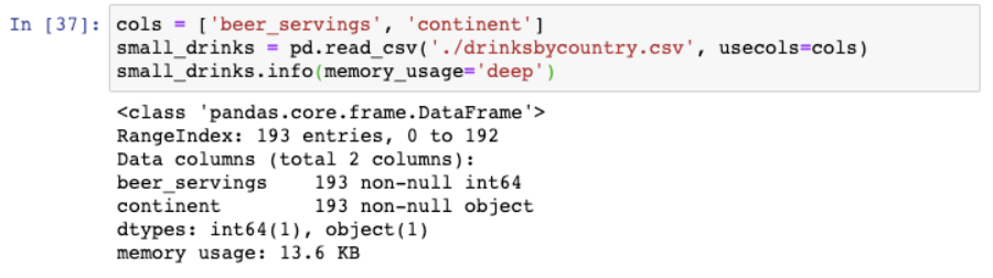 通过仅读取用到的两列,我们将DataFrame的空间大小缩小至13.6KB。