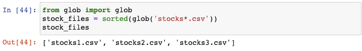 更好的方式为使用内置的glob模块。你可以给glob()函数传递某种模式,包括未知字符,这样它会返回符合该某事的文件列表。在这种方式下,glob会查找所有以stocks开头的CSV文件: