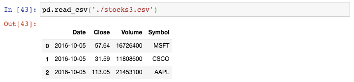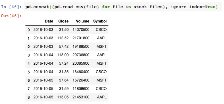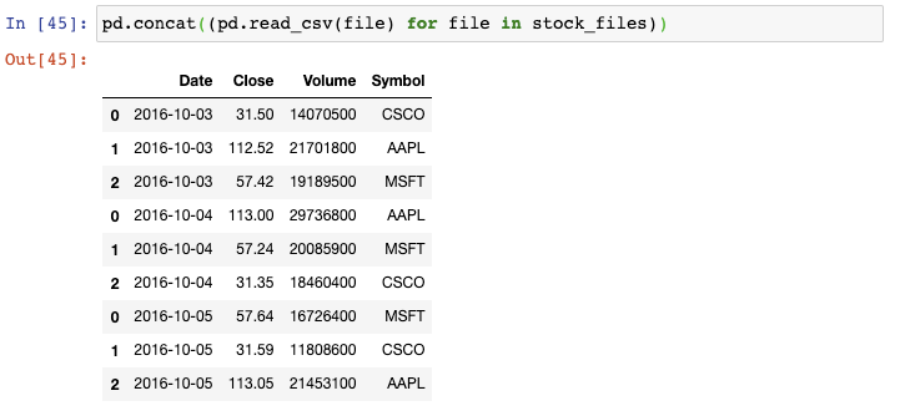 我们以生成器表达式用read_csv()函数来读取每个文件,并将结果传递给concat()函数,这会将单个的DataFrame按行来组合: