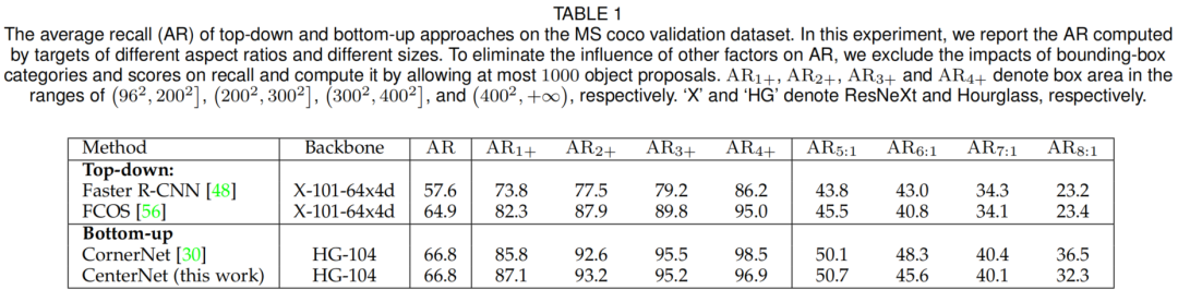 图1(a)是一个典型的例子。作者还提供了一个定量研究,如表1所示。在MS-COCO验证数据集上对三种具有代表性的方法以及本文的工作进行了评估。表1显示,Top-down方法的召回率明显低于Bottom-up方法,特别是对于具有特殊几何形状的对象,例如,规模大于