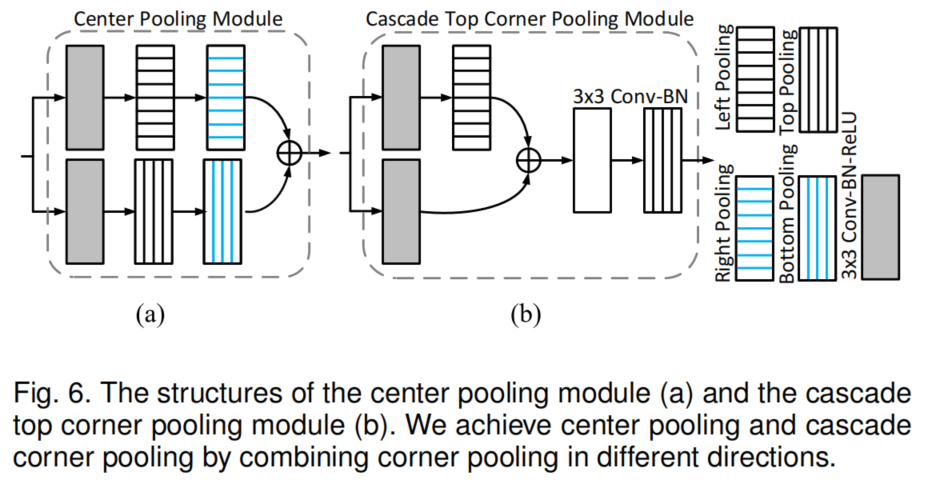 Center pooling模块的结构。要在特定的方向(如水平方向)取最大值,只需要依次连接左、右池化即可。图6(b)显示了