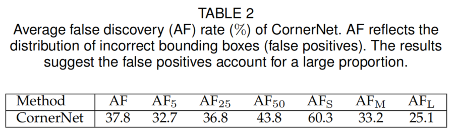 在表2中,作者对CornerNet进行了更深入的分析。计算了MS-COCO验证数据集上CornerNet的AF(average false discovery,AF=1−AP)。结果表明,即使在较低的IoU阈值下,错误的边界框也占很大比例,例如,在IoU=0.05时,CornerNet获得32.7%的AF。这意味着平均每100个物体预测框中有32.7个IoU低于0.05。小的不正确的边界框更多,达到60.3%的AF。其中一个可能的原因是,CornerNet无法查看边界框内的区域。