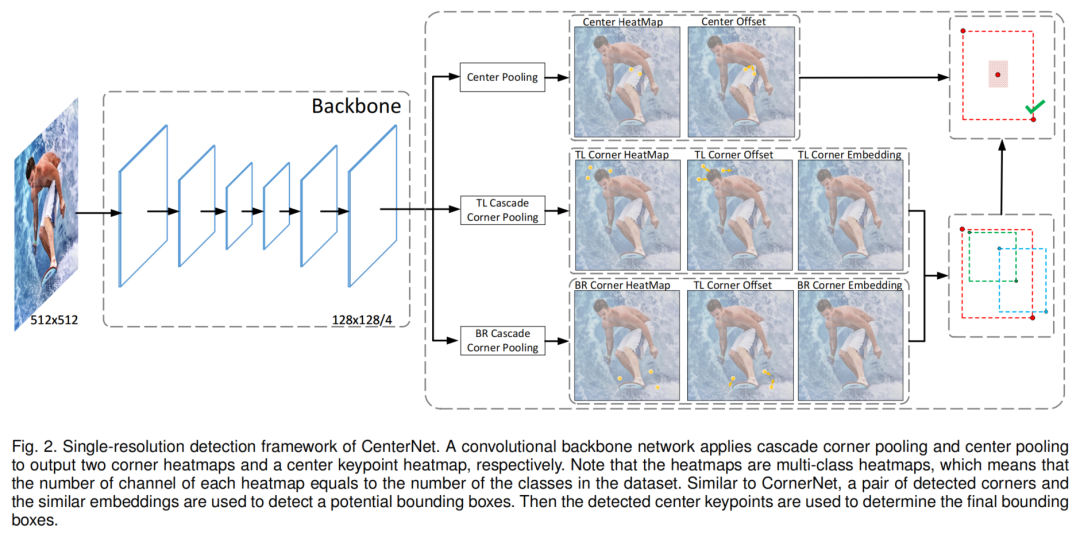 整个网络架构如图2所示。用一个corner keypoints和一对center keypoints来表示每个对象。在此基础上,嵌入了corner keypoints heatmap,并预测了corner keypoints的偏移量。然后,使用在CornerNet中提出的方法生成top-k边界框。但是,为了有效地过滤出不正确的边框,利用检测到的center keypoints,采用以下步骤: