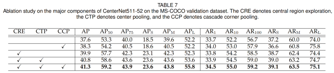 表7中的第4行显示了Center pooling通过以下方式改进AP0.9%(由39.9%至40.8%)。值得注意的是,在Center pooling的帮助下,将大目标的AP提高了1.4%(52.2%到53.6%),这远远高于使用传统卷积的改进(即1.4% vs. 0.1%)。