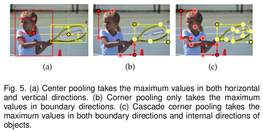 corner通常是物体的外部,缺乏局部外观特征。CornerNet使用Corner pooling来解决这个问题。Corner pooling原理如图5(b)所示。Corner pooling的目的是在边界方向上找到最大值来确定corner。然而,这使得corner对边很敏感。为了解决这个问题,需要让corner从对象的中心区域提取特征。