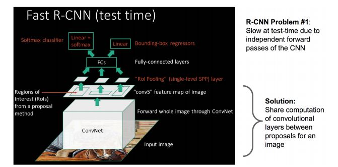 解决:共享卷积层,现在不是每一个候选框都当做输入进入CNN了,而是输入一张完整的图片,在第五个卷积层再得到每个候选框的特征