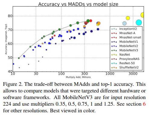 下图是ImageNet分类精度、MADD计算量、模型大小的比较,MobileNetV3依然是最优秀的。