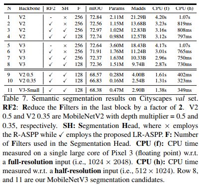 在Cityscapes语义分割任务中,新设计的模型MobileNetV3-Large LR-ASPP 与 MobileNetV2 R-ASPP分割精度近似,但快30%。