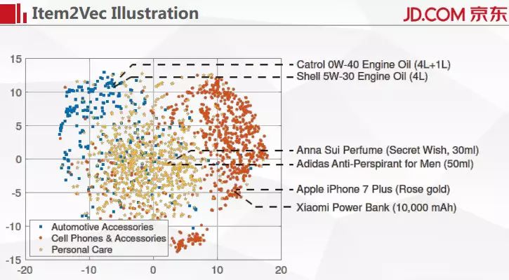 我们来看一个更为广泛的例子,随机在三个品类里面找出若干个商品,然后进行 Item2Vec 编码再进行降维。我们采用了汽车用品、手机和附件、个人护理这三个类别。可以看到这三种类型的商品在这个二维的空间里面比较明显的被分割到三个不同的区域,这说明 Item2Vec 的有效性还是很强的。我们做的 Item2Vec 编码参考的完全是用户的浏览行为,没有跟商品的标题做语意上的匹配。