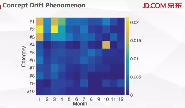 在欺诈领域还有一个非常有意思的现象。欺诈其实是人产生的,既然有人在,整个欺诈行为就会随时间发生变化。上面这幅图里展示的就是欺诈用户喜欢购买的商品。比如在 1 月份可以看到欺诈用户特别喜欢 2 号商品,但随着时间发展,到 10 月份时,这些用户对 2 号商品就没那么感兴趣了。我们的系统需要去适应用户行为的改变,我们需要周期性的对模型进行不断的更新。