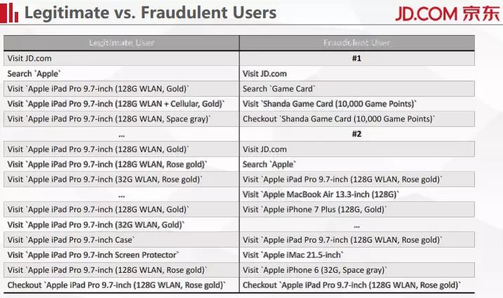 上面这个表左边展示的是正常用户的浏览路径,可以看到这个用户最后买了一个 128G 的 wifi 版玫瑰金 iPad Pro,整个浏览路径非常有规律。对于欺诈用户而言,看右边这两个用户,从统计上来说有两个比较鲜明的特点。