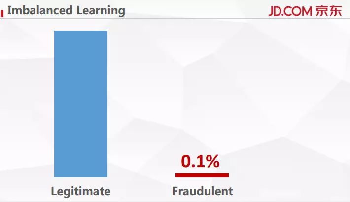 一个非常直接的挑战首先是我们拿到的样本是一个非常不平衡的样本,这就是所谓的非平衡样本的学习问题。从上面这幅图中可以明显看到欺诈用户和正常用户的占比大概是千分之一, 非常小。在研究过程里面,我们固定了千分之一的欺诈占比,又称异常占比。异常占比小的问题会对系统的学习造成很大的干扰。