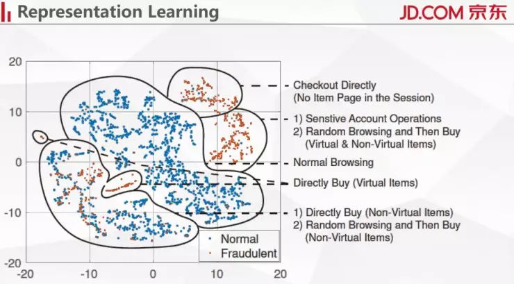最后展示的是我们做的比较有意思的一个结果。这幅图里用户的行为可以比较明显的区分出来。例如右上角,这部分样本表示在 session 里面没有发现用户在浏览商品,而直接进行了付款,这是为什么?因为我们并没有把用户从第一个商品浏览到最后全部采集下来。后续我们把用户的浏览行为拼接起来,找到之前的 session,这样的话性能会更好。