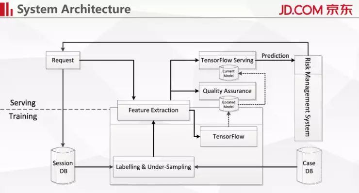 第二个问题就是如何解决庞大的访问量,我们整个系统的架构如上图所示。架构分成两部分,下面是训练,上面是进行预测,训练采用的是 Tensorflow,预测用了 Tensorflow Serving 的开源模块。下面是模型进行滚动更新的部分,更新后的模型会送到上面,然后会有 QA 模块进行决定是否切换掉现有的模型。