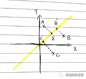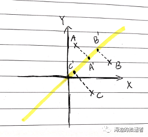 如上图所示,假设我们的原始数据A, B, C是在直角坐标系中的三个点,它们的坐标分别为A(x_a, y_a), B(x_b, y_b), C(x_c, y_c),那么我们现在想要使用pca,将这三个在平面上的点降维到直线上(也就是上图中黄色的线上)。那么现在的问题就是: