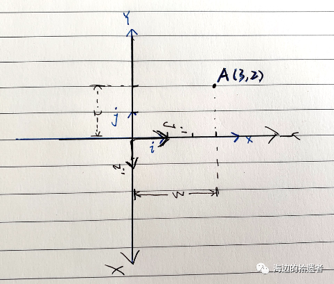 A点在普通直角坐标系中为(3, 2),在新的直角坐标系中为(-2, 3)。新的坐标(-2, 3)可以通过以下方式计算: