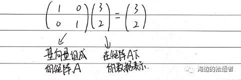 在解决这个问题之前,我们先用矩阵描述一下上一个问题,比如我们现在基向量为(0,1)和(1,0)的坐标中表示(3,2),则可以写作为: