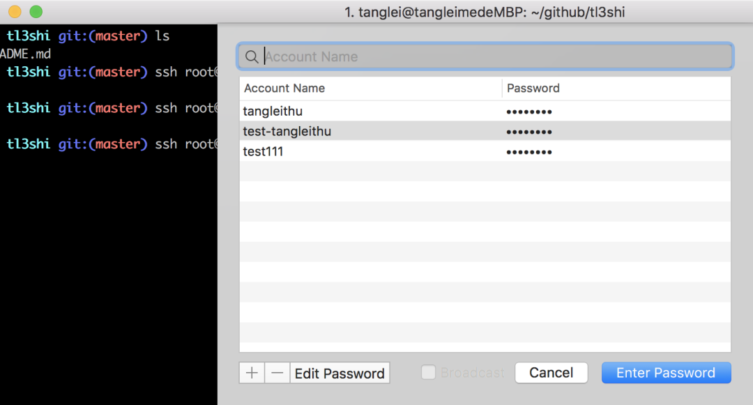 这个功能可能会常用,程序猿得经常登录到远程服务器吧,密码又记不住。可以把常用密码保存起来,需要输入密码的时候,用快捷键 Option + cmd + f 弹出密码管理器,选择一个自动输入即可。