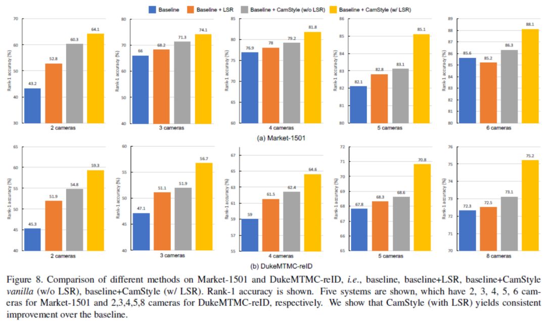 特别地,图8和表1显示,仅在真实数据上使用LSR,对全相机系统的性能没有多大帮助,甚至降低了性能。因此,与LSR相比,CamStyle与LSR的改进并不仅仅归功于LSR,而是LSR和假图像之间的交互。通过这个实验,我们证明了在假图像上使用LSR的必要性。