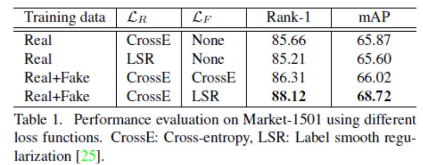 对于真实图像,我们不使用LSR,因为它们的标签与图像内容正确匹配。此外,我们通过实验证明,在真实图像中添加LSR并不能提高全摄像系统下的重新识别性能。所以对于真实的图像,我们使用单热标签分发。对于风格转移的图像,我们设置,损失函数