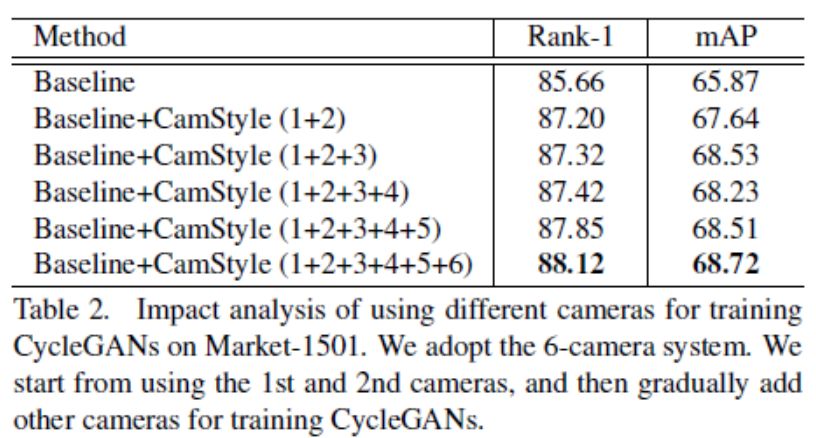 在表2中,我们展示了使用更多的摄像头来训练相机感知的样式传输模型,rank-1的精度得到了提高。from 85.66% to 88.12%.特别地,我们的方法在rank-1精度上得到了+1.54%的改进,即使只使用第1和第2个摄像头来训练相机感知的样式传输模型。此外,当使用5个摄像头训练相机风格的传输模型时,它的rank-1精度为87.85%,比使用6个相机的准确率低0.27%。这表明,即使使用摄像机的一部分来学习相机感知的样式传输模型,我们的方法也可以产生大约相同的结果来使用所有的摄像头。
