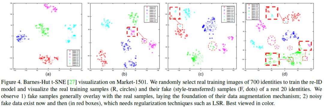 在图4中,我们将二维空间中真实和虚假数据的深层特征的一些例子可视化。大部分生成的样本都分布在原始图像周围。当传输错误发生时(见图4(c)和图4(d)),假样本将是一个噪声样本,并且与真实分布相距很远。当真实图像是噪声样本图像(参见图4(b)和图4(d))时,它与标签相同的图像相距很远,因此其生成的样本也会很嘈杂。这个问题减少了全摄像系统下生成的样本的好处,其中相对丰富的数据具有较低的覆盖风险。为了缓解这个问题,我们将标签平滑正则化(LSR)应用于样式传输的图像,以轻柔地分发他们的标签。也就是说,我们对ground-truth标签的信任度较低,并为其他类别分配较小的权重。每个风格转移图像的标签分布的重新分配被写为,