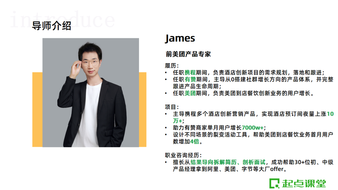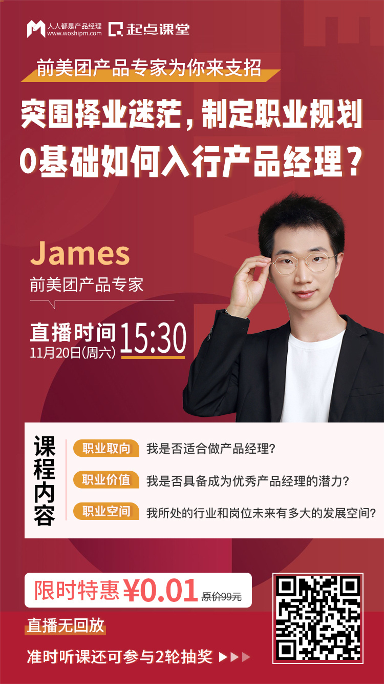 由此,我们特邀前美团产品专家@James授课。来跟大家讲解如何做好系统而专业的产品经理职业发展规划,以帮助新人们更好地认识自己和产品岗,规划好自己的产品进阶路线。