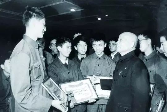 ►著名数学家苏步青在上海市数学竞赛发奖大会上给第一名获得者李骏(左一)颁奖。图片来源:fudan.org.cn.