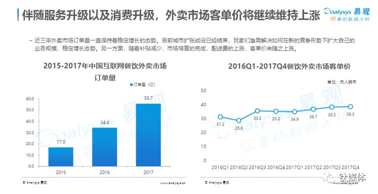 易观在3月发布了《2018中国互联网餐饮外卖市场年度综合分析》中显示,国内外卖市场订单量已经高达55.7亿单,平均客单价也都在35元左右,且未来三年,餐饮外卖市场规模还将保持稳中增长态势。