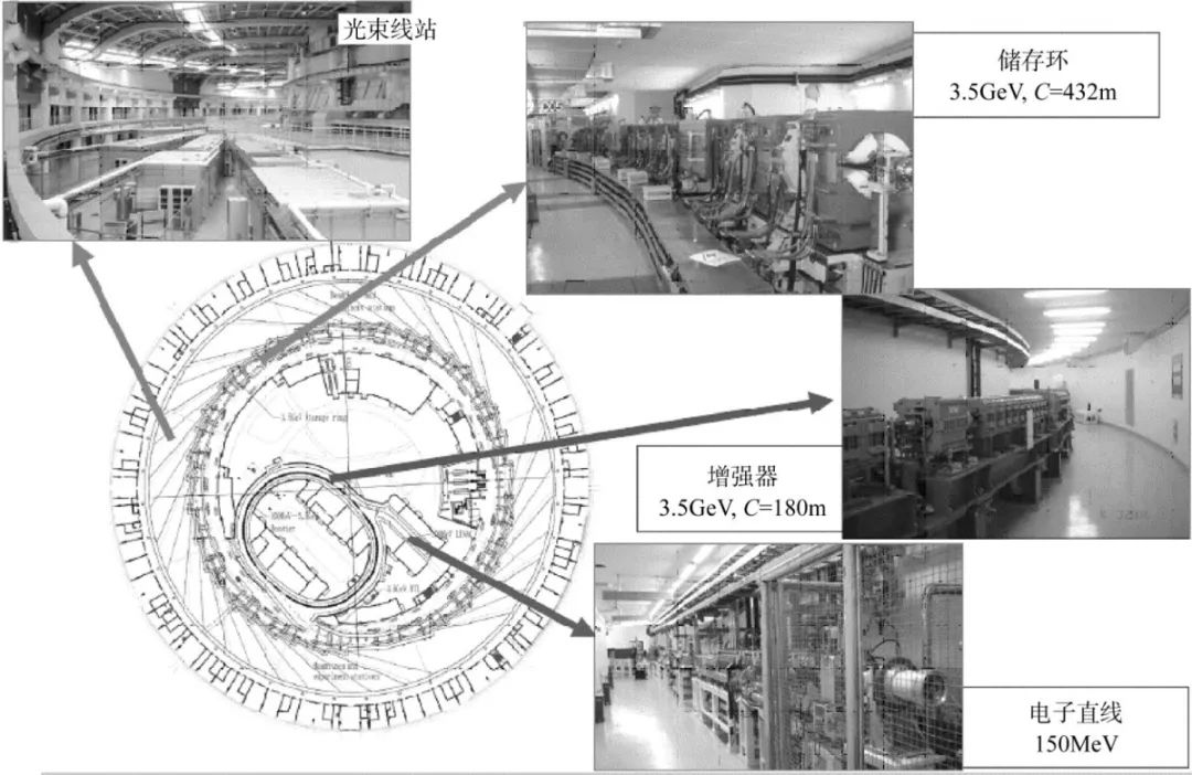 上海光源主要由两大部分组成。一个是加速器部分,主要用来将电子加速至所需要的能量并在储存环中储存足够多的电子,电子的能量决定了同步辐射所产生的光子的能量区间,电子的数量则决定了同步辐射光的亮度;另一个部分是光束线站,电子经过储存环中的二极磁铁时,会沿其运动的切线方向发出具有一定的空间分布和频率分布的同步辐射光,通过光束线上的狭缝、单色器和聚焦镜对这一同步辐射光进行筛选和聚焦后,就可以得到可供用户使用的特定频率的稳定的各种光源,不同的光束线的结构可以得到不同波段不同尺寸的同步辐射光源,如硬X射线、软X射线等。上海光源通过使用不同种类、不同参数的插入件,能够为用户提供从0.1~70keV之间的高性能同步辐射光。图1是上海光源加速器和光束线的结构简图。