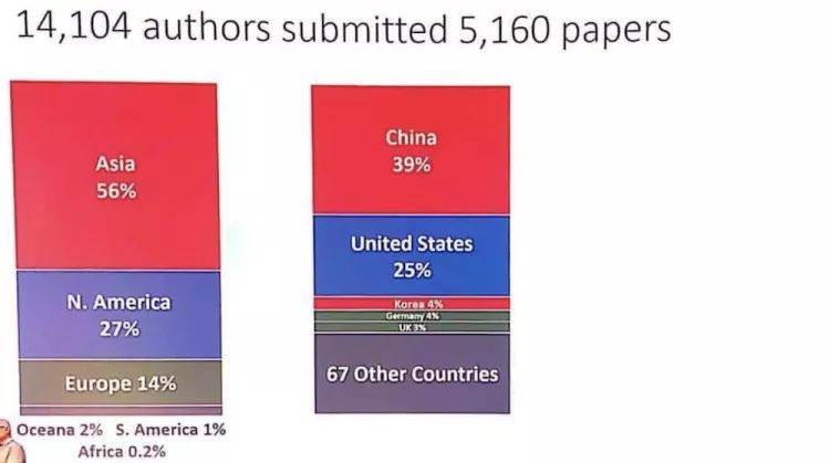 大会主席团成员朱松纯教授在开幕演讲中透露,CVPR 2019 共收到超过1.4万名作者投稿的5,160篇论文。按照提交者国别统计,来自中国的论文占到了39%,超过美国(25%),在全部72个国家中也遥遥领先。
