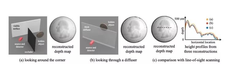比如在上图中,例子(a)显示相机和硬币之间被障碍物挡住,直接视角只能看到硬币侧面;例子(b)显示相机和硬币之间有一张不透明的纸。研究者设计的计算机视觉系统可以通过几何光学原理,结合硬币在可见表面上的投影,最终重建出一个相当准确的硬币表面浮雕。
