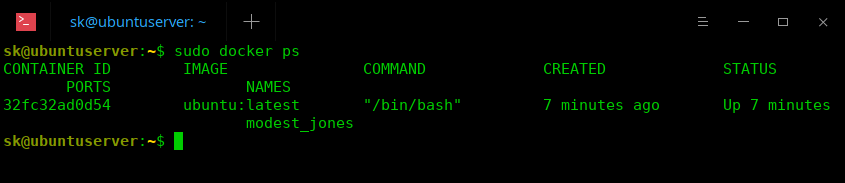 32fc32ad0d54 ubuntu:latest "/bin/bash" 7 minutes ago Up 7 minutes modest_jones