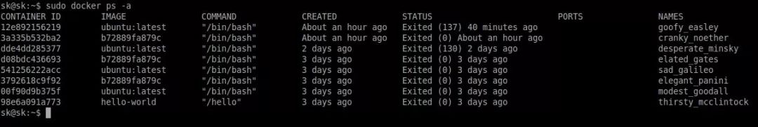 可以通过以下命令查看所有正在运行和停止运行的容器: