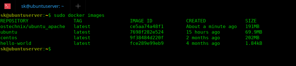 ostechnix/ubuntu_apache latest ce5aa74a48f1 5 minutes ago 191MB