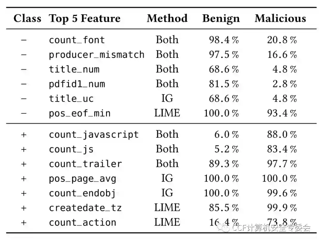表3. 使用IG和LIME为Mimicus+预测的恶意PDF文档进行解释。