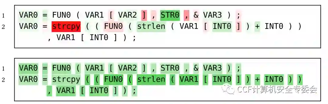 为了可视化解释的相关向量,图表中均将支持决策的特征标记为绿色,与决策相矛盾的特征标记为红色,颜色的亮度则反映了特征的重要性。图2中展示了使用白盒和黑盒解释方法对深度学习系统VulDeePecker决策的解释。白盒解释方法提供了相关特征的细粒度表示,而黑盒方法则产生了不清晰的解释,难以帮助研究人员理解神经网络是如何做出决策的。然而,使用上述两种方法均会将与安全漏洞无关的标点符号突出展示出来,如函数调用后的分号或括号。在研究的四个深度学习系统中,均发现了这类与安全无关但对预测结果有较大贡献的特征。因此,作者认为解释方法需要与深度学习的安全系统相结合,不仅可以用于理解神经网络生成的决策,还可以识别和消除学习过程中的干扰因素。