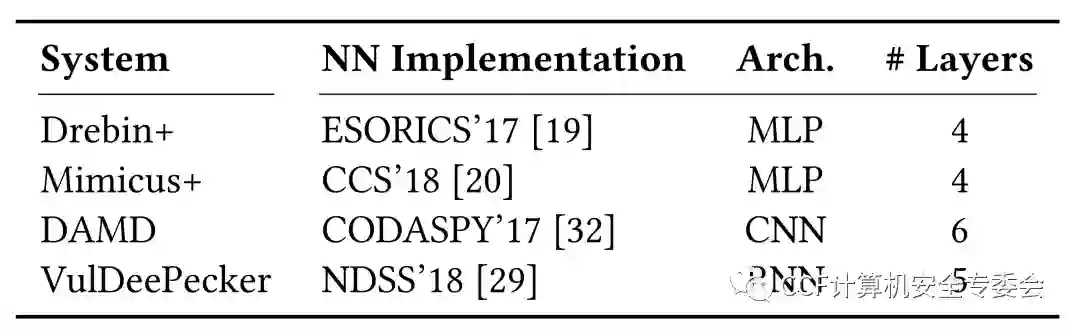 作者在论文中使用了四个深度学习安全系统来测试白盒和黑盒解释方法的性能,包括两个Android恶意软件检测系统:Drebin+是用于识别Android恶意软件的多层感知器、DAMD可以识别恶意Android应用程序;一个恶意PDF检测系统(Mimicus+)和一个安全漏洞预测的系统(VulDeePecker)。为了验证代码实现的正确性,以上四种安全系统均在相应的原始数据集上进行了训练,所得结果均与文献报道保持一致。