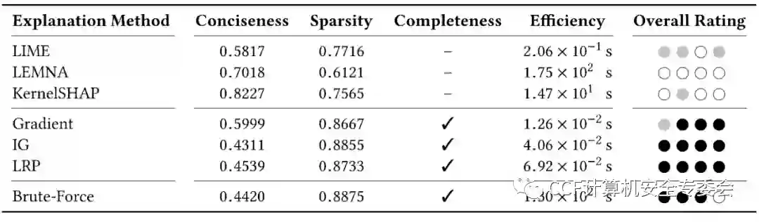 表2. 解释方法得到的四个指标的平均结果。最后一列总结了由三个级别组成的评级,圆圈的颜色为黑、灰和白,分别表示“强”、“中”和“弱”的等级。