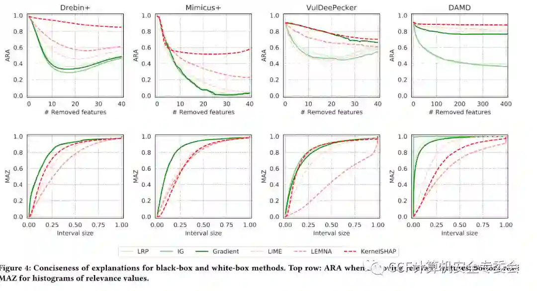 如图1所示,通过计算曲线下面积(AUC)可知,白盒解释方法的简洁性平均比黑盒方法高30%,且白盒方法的效果总是接近甚至优于Brute-force方法。在稀疏性方面,白盒解释方法的稀疏度比黑盒方法高19%,白盒方法为更多特征分配了接近于零的值,而黑盒解释方法给出的特征的相关性值在零附近的分布更广,从而使MAZ的斜率更小,接近于0。此外,该论文也对解释方法的完整性和效率进行了评估。白盒方法在四个安全系统中均适用,而黑盒方法则存在受到限制和无法给出有意义结果的情况。白盒方法比Brute-force方法快得多,黑盒则与之效率较为接近。计算四个指标的平均值可以系统性地比较上述6种方法(表2),可知只有白盒解释方法在所有的指标中都被评为了“强”的等级。