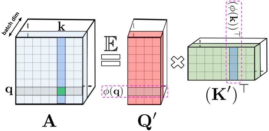 左侧:标准注意力矩阵,包含每一对条目的所有相似性得分(通过对 query 和 key 进行 softmax 运算得到),表示为 q 和 k;右侧:标准注意力矩阵可通过低秩的随机矩阵 Q′ 和 K′ 来近似,其中的行对原始 query/key 的潜在随机非线性函数进行编码。对于常规的 softmax-attention,该转换非常紧凑,并且涉及指数函数以及随机高斯投影