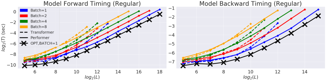 在以时间 (T) 和长度 (L) 都以对数坐标表示的坐标图中,常规 Transformer 模型的双向计时。达到 GPU 内存上限后,线条中断。黑线(带有 X 标记)表示使用“伪”注意力模块时,可实现的最大内存压缩和注意力加速,其基本上绕过了注意力计算,并代表模型的最优效率。Performer 模型几乎能够在注意力组件中达到这一最佳性能